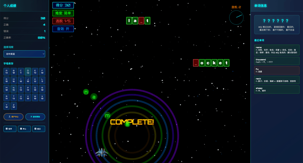 单词雷电 – 太空射击英语学习 🌟 打开网页就能玩,完全免费! 单词雷电