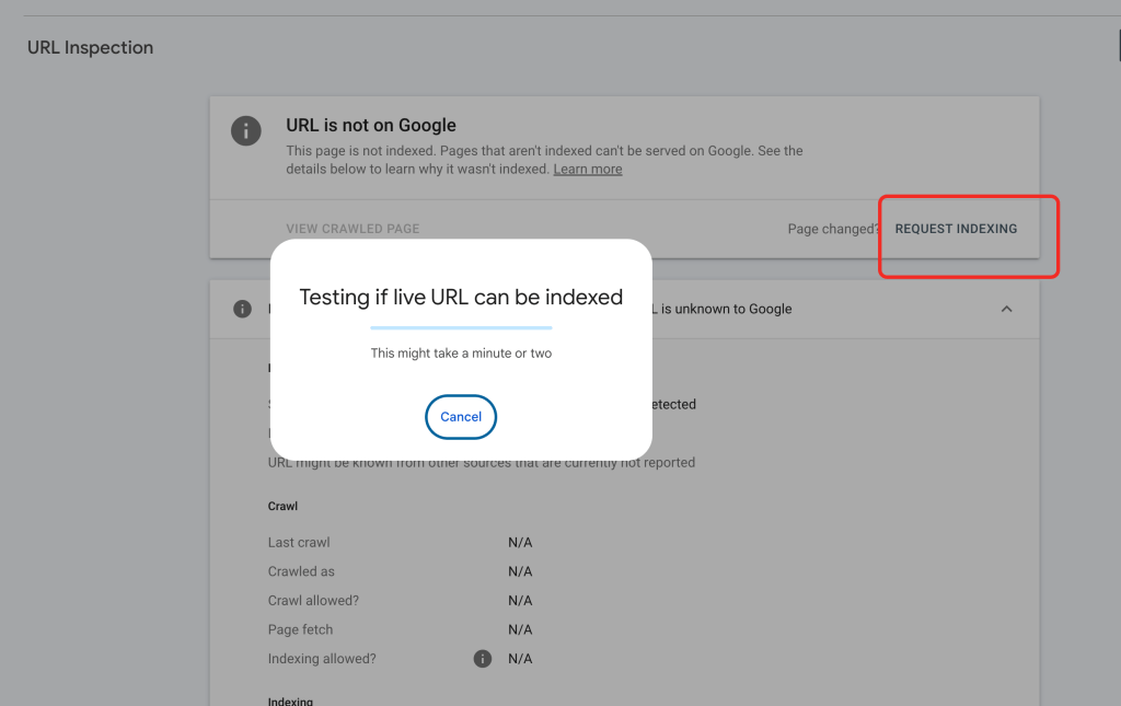 此时Google提示该页面尚未被收录,点击“REQUEST INDEXING”按钮,请求索引。