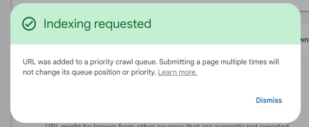 稍后将看到“Indexing requested”弹窗。