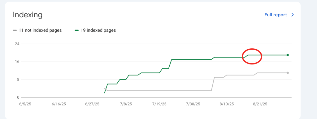 通过查看Google Search Console后台可知,网站被索引的页面出现了数据小平台,8月份之后的文章一直没有被收录。