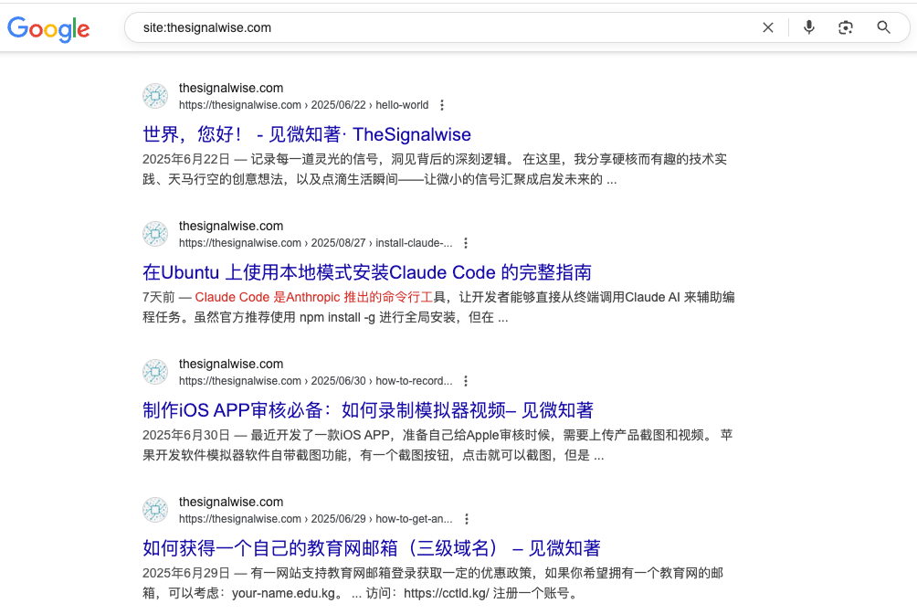 TheSignalWise网站近期有频繁更新,但是在Google Search使用命令“site:thesignalwise.com” 查询不到最近更新的内容,初步判断是:Google搜索针对网站的收录暂停/中断。