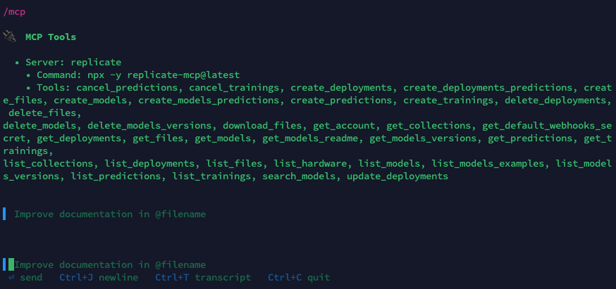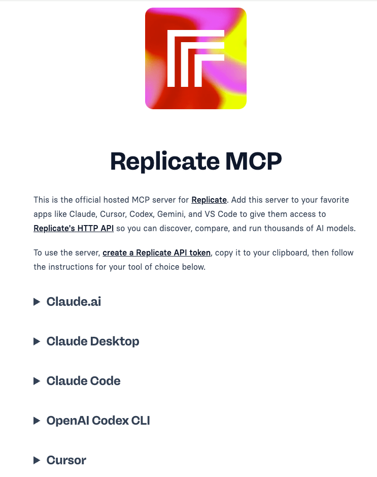 根据官方介绍,您还可以在其他AI IDE中使用replicate mcp server,如:Cursor,Chorus,Google Gemini CLI,Windsurf。